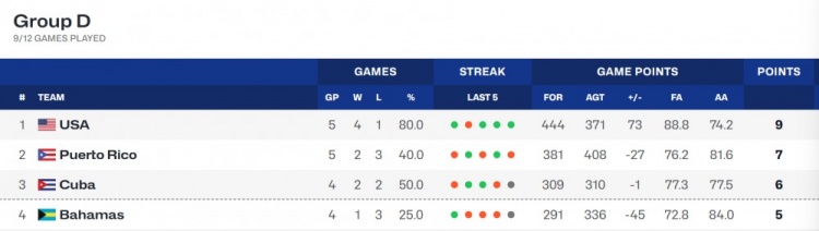 目前,美國男籃4勝1負(fù)積9分,暫時排在D組第一。