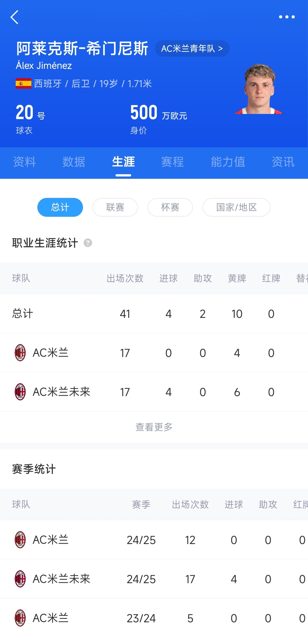 2024年夏窗,希門尼斯以500萬歐元的買斷費(fèi)正式從皇馬加盟米蘭,簽約至2028年。本賽季希門尼斯已經(jīng)代表AC米蘭出戰(zhàn)12場(chǎng)比賽,出場(chǎng)時(shí)間685分鐘。