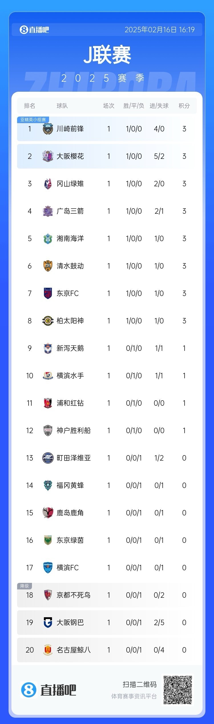 J1聯(lián)賽積分榜如下??