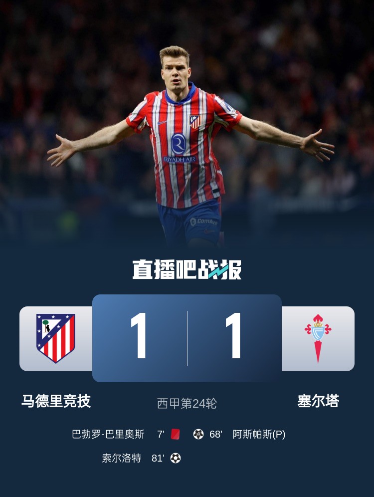 本輪西甲,馬競(jìng)1-1塞爾塔,落后榜首1分。