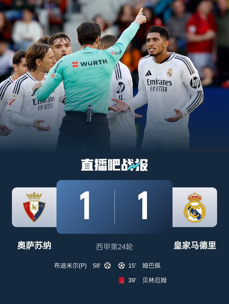 判罰爭(zhēng)議不斷!皇馬本輪1-1戰(zhàn)平奧薩蘇納,姆巴佩破門,貝林厄姆染紅。